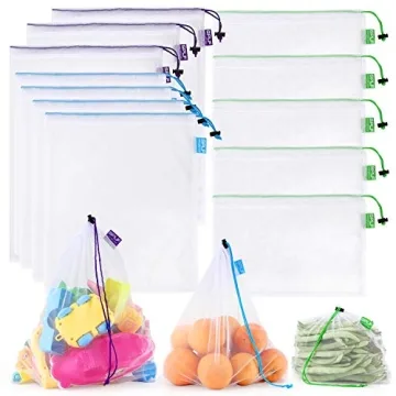 SPLF 12 Pcs Heavy Duty Reusable Mesh Produce Bags, Barcode Scanable See Through Food Safe Mesh Bags with Drawstring for Fruits, Vegetable, Food, Toys, Grocery Storage, Large Medium Small