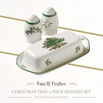 Spode Christmas Tree 3-Piece Hostess Set - Butter Dish with Lid, Salt Shaker, Pepper Shaker - Festive Earthenware for Christmas, Holiday Entertaining - Dishwasher Safe Collectible Gift Set