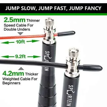 Show more Introducing our high-performance jump rope set that transforms every workout into an exciting experience. With two distinct cables, one thicker (4.2mm) for strength and endurance training and one thinner (2.5mm) for cardio and HIIT workouts, you can customize your exercise routine to fit your needs. Designed with PVC coated cables, it's not just about flexibility in training; it's about enhancing your performance!
