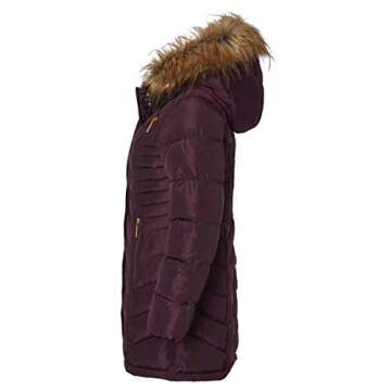 Sportoli Women Long Quilted Down Alternative Plush Lined Puffer Jacket Coat Fur Trim Hood - Wine (Medium)