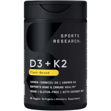 Show more Discover the ultimate health enhancement with Sports Research Vitamin D3 K2 softgels, a clever blend of two essential vitamins to help fortify your body for optimal performance. This expertly formulated supplement combines the strength of Vitamin D3 and the critical guidance of Vitamin K2 to maximize nutrient absorption and promote bone health. With a potent 5000 IU dose of Vitamin D3 and 100 mcg of K2, you can trust in its ability to not only strengthen bones but also to aid in proper calcium distribution within the body, reducing potential risks to your joints and cardiovascular system.