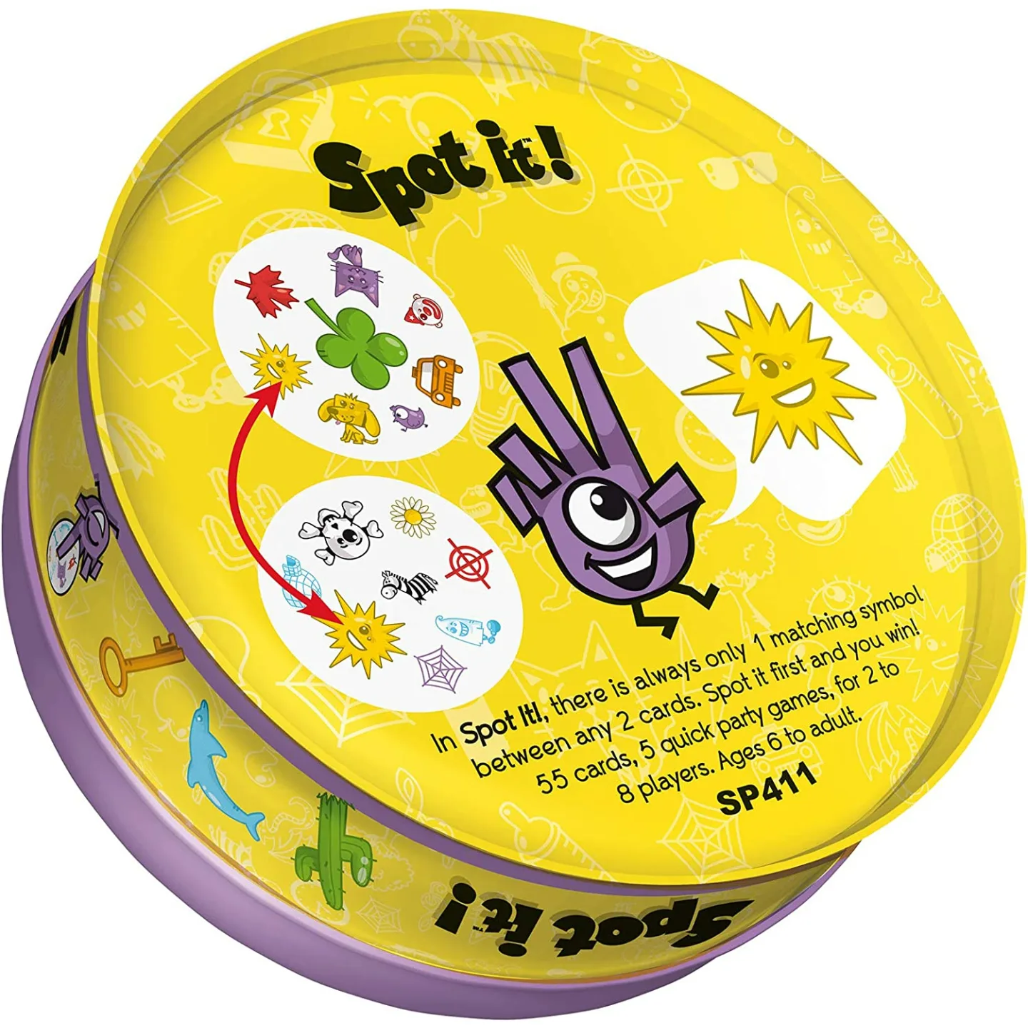HOUSEHOLD GAME NIGHT: Spot It! turns any ordinary family game night into an adventure. Each card features multiple images, with one symbol common between any two cards in the deck. The excitement builds as you race to spot the match first and claim victory! This game is perfect for enhancing concentration, visual perception, speech and language, and fine motor abilities, making it suitable for players of all ages.