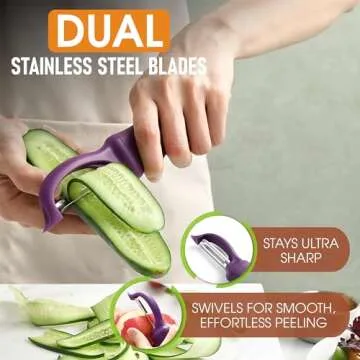 Show moreIntroducing the Spring Chef Professional Purple Swivel Vegetable Peeler, the ultimate kitchen companion designed to make your food preparation quick and enjoyable. This peeler features dual stainless steel blades that remain ultra-sharp, enabling a smooth and effortless peeling experience like no other. With its unique swivel design, this tool glides effortlessly over fruits and vegetables, ensuring you achieve the perfect peel every time. It doesn’t just stop at peeling; it also comes with a built-in blemish remover, making it an all-in-one solution for even the most blemished produce!