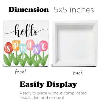 Show more If you are searching for the perfect spring-themed decoration to brighten up your space, look no further than this exquisite wooden block sign. Measuring a compact 5 x 5 inches, it is ideal for displaying on desks, shelves, or tables without any need for installation. Its effortless charm ensures that it blends seamlessly into various settings, whether it be in your home, office, or any other favorite space.