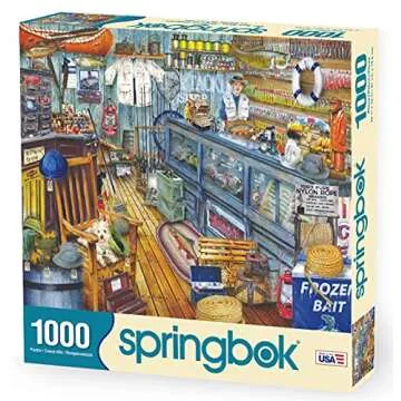 Show more Discover the joy and challenge of the Springbok Puzzles - The Bait Shop 1000 Piece Jigsaw Puzzle. Measuring an impressive **30 inches by 24 inches**, this puzzle invites you into a vivid portrayal of a serene bait shop, making it a delightful addition to any puzzle enthusiast’s collection. Each piece is handcrafted with precision, ensuring a perfect fit and a stunning visual once completed. The Springbok name is synonymous with quality and durability, as their puzzles are made in the USA since 1963, emphasizing craftsmanship and local industry.