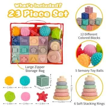 Show moreThe **Springflower 3 in 1 Montessori Toys for Babies** is an intuitive and engaging sensory set designed specifically for your little ones aged 0-3-6-12 months. This delightful toy collection includes a total of 23 pieces, featuring 12 vibrant stacking blocks, 6 soft stacking rings, and 5 sensory balls that produce cheerful squeaking sounds when squeezed. Crafted with care, these toys boast the perfect size to fit snugly in tiny hands, allowing for easy gripping and stacking. Parents can feel confident knowing these toys support healthy development through play, making them a perfect match for curious infants and toddlers.