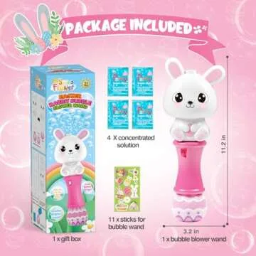 Show more Introducing the SpringFlower Bubble Blower Wand, the ultimate bubble maker that promises to bring joy and excitement to your little ones this Easter! This vibrant bubble toy features a captivating light-up effect that changes colors, making it not only a bubble dispenser but also a delightful visual treat. Each super value pack includes a bubble blower wand, a 3.8 oz bottle of bubble solution, and four additional bubble supplement packs for endless fun. Designed in an adorable bunny theme adorned with playful Easter stickers, this bubble wand is sure to be a hit at all your family gatherings and outdoor celebrations!