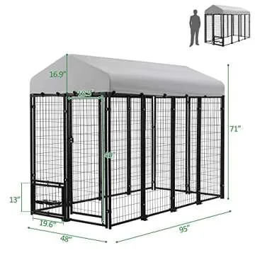 Show more Welcome your furry companion to a realm of safety and comfort with the Spurgehom Large Dog Kennel Outdoor Dog House. Crafted from heavy-duty welded metal featuring a robust 0.95mm wide tube wall and 3mm wide wire, this kennel guarantees unparalleled durability and reliability even for the most playful pets. Designed specifically for pet owners who prioritize quality and safety, the Spurgehom kennel offers a secure, cozy space that allows your dog to relax and play without worries.