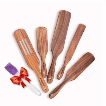 Spurtles Kitchen Tools Wooden, Wooden Spurtle Set of 5, Peanut Butter Stirrer Tool as seen on Tv Products, Wooden Spoons for Cooking Made of Finest Acacia, Spatulas for Kitchen (Bonus silicone Brush)