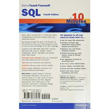 Unlock the power of databases and data management with 'SQL in 10 Minutes, Sams Teach Yourself', a comprehensive guide designed for both beginners and those looking to brush up their SQL skills. This book offers a practical approach, breaking down crucial SQL concepts into manageable, bite-sized lessons that can be completed in just 10 minutes each. Whether you have prior knowledge of SQL or are starting from scratch, this resource stands out for its clarity, hands-on examples, and engaging...