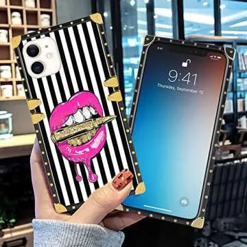 Square Case Compatible iPhone 11 2019 6.1 Inch Pink Lips Luxury Elegant Soft TPU Shockproof Protective Metal Decoration Corner Back Cover Case iPhone 11 Case