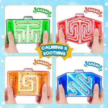 Show more Introducing the 4 Pack Squishy Fidget Sensory Toys: a uniquely designed interactive experience that combines fun with sensory stimulation! Each toy boasts a twisted maze-like design filled with a captivating mix of goo, glitter, and beads. With every squeeze, you’ll hear the delightful 'sasa' sound of colliding beads and watch the colorful liquid rush and gush back and forth, providing mesmerizing visual stimulation for both kids and adults alike.