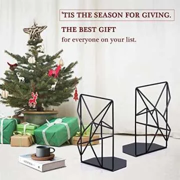 SRIWATANA Bookends Black, Decorative Metal Book Ends Supports for Shelves, Unique Geometric Design(1 Pair/2 Pieces)