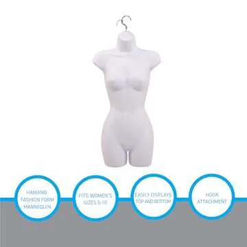 Show moreIntroducing the SSWBasics Female Mannequin Torso - the perfect solution for showcasing your garments and accessories in styles that captivate. Designed to fit women’s sizes 5-10, this stunning dress form features a durable, opaque white finish that complements any display setting. Crafted from flexible, shatterproof plastic, it's built to withstand repeated use, making it a long-lasting addition to your fashion arsenal. The open hollow back design adds versatility, allowing dresses and tops to hang beautifully while providing a 360-degree view for potential customers.