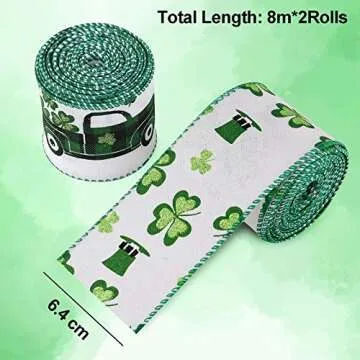 St. Patrick's Day Burlap Ribbons Wired Edge Spring Ribbon Rolls Shamrock Green Hat Truck Patterns for Wrapping Crafts Gift St. Patrick's Party Decoration 2 Rolls (2.5", 17.5yd)