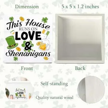 St. Patricks Day Decor This House Runs on Love and Shenanigans Wood Sign St Patricks Day Decorations Home Kitchen Desk Tabletop Shelf Decor 5 x 5 Inches
