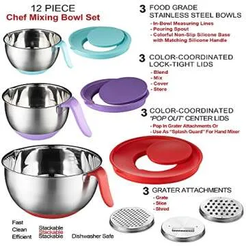 Show moreThe Stainless Steel Mixing Bowls with Lids are designed to cater to all your kitchen needs with a versatile set that includes three different sizes: 1.5, 3, and 5 quarts. Crafted from premium stainless steel, these bowls promise durability while resisting dents and rust, ensuring they serve you well for years to come. The stunning mirror finish enhances their aesthetic appeal, while the colorful silicone bottoms provide a stable, non-slip base, allowing you to mix ingredients without fear of spills or accidents. Each bowl comes equipped with a convenient plastic lid, perfect for storing leftovers or prepped ingredients without drying out. Plus, the set includes three graters, catering to various grating tasks, from cheese to vegetables, making meal preparation a breeze.