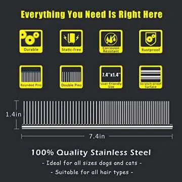 Stainless Steel Pet Grooming Comb - Rounded Teeth, Static-free, Corrosion Resistant, Dematting and Flea Removal for Dogs and Cats - 7.4in