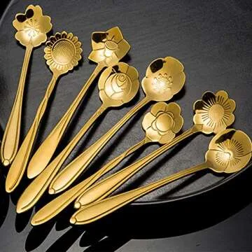 Show more Introducing an exquisite set of spoons that combine practicality with artistry! This set of 8 stunning stainless steel spoons features elegant designs inspired by various beautiful flowers, making each piece a unique addition to your kitchenware. Crafted with a focus on superior quality, each spoon measures 4.9 inches in length, offering a perfect size for a variety of uses—from stirring your favorite beverages to indulging in a dessert. The high-quality stainless steel construction not only guarantees durability but also ensures that these spoons will never bend, rust, or shed paint. Maintenance is a breeze as these spoons are dishwasher safe, allowing you to enjoy your time without worrying about tough stains or scrubbing dishes.