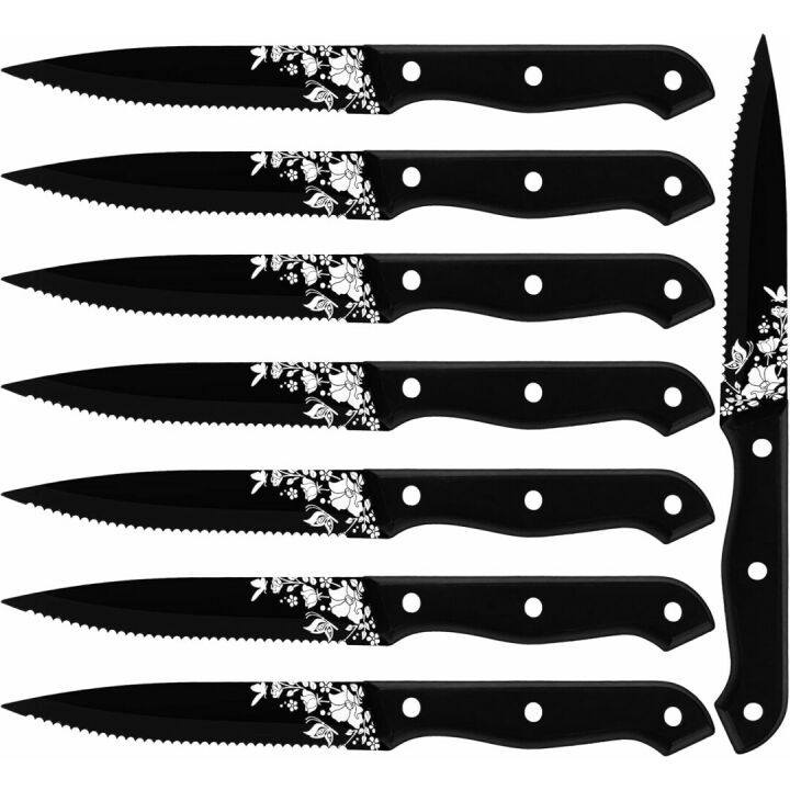 Show moreDiscover the ultimate combination of elegance and functionality with the Stapava Steak Knives Set of 8. Crafted from premium stainless steel, these steak knives are designed to elevate your dining experience, whether it's a casual family dinner or an upscale dinner party. The sleek, black finish and intricate laser patterning on the blades make these knives a striking addition to any table setting. Each knife features a sharp, serrated edge that effortlessly cuts through meat, making every meal remarkably enjoyable. Not only are these knives visually appealing, but they also offer exceptional performance and durability, ensuring they remain sharp even after numerous dishwasher cycles.