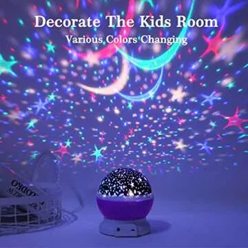 Show more Experience the wonder of the cosmos right from your child's bedroom with the Star Moon Night Lights Projector. This enchanting star night light transports your kids into a vast universe adorned with colorful moons and twinkling stars, sparking their curiosity about the cosmos and nurturing their boundless imagination. Designed to alleviate fear of darkness, this night light provides a gentle, soft glow, ensuring peaceful sleep without disruption.