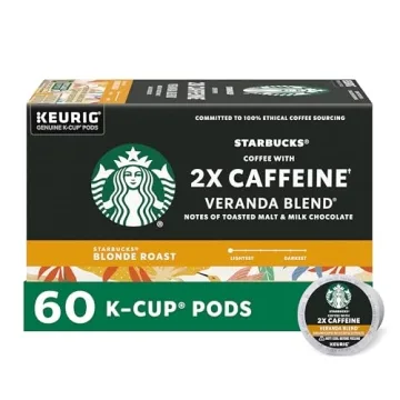 Show moreExperience the rich aroma and invigorating taste of Starbucks Coffee With 2X Caffeine Veranda Blend K-Cup Pods, designed for those who appreciate a flavorful kick to their day. This exceptional product from Starbucks offers a bold yet smooth blonde roast with twice the caffeine of a standard K-Cup, perfect for getting you energized whenever you need it. Each pod is meticulously crafted with natural coffee extracts, ensuring that every sip is filled with genuine flavor without the usual bitter aftertaste found in many other brands. With 60 total pods included, it's an ideal choice for coffee lovers who enjoy their favorite brew at home, tailored to their specific taste preferences.