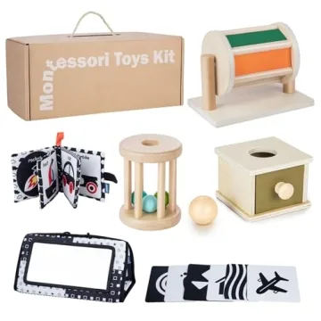 Show more The Montessori Toy Set is an innovative collection designed specifically for infants aged 0 to 6 months, fostering sensory development through engaging play. This thoughtfully curated set features essential components like the Object Permanence Box, Tummy Time Mirror, Baby Roller, and Spinning Drum, all tailored to stimulate a baby's curiosity and enhance their sensory experiences. As babies explore these toys, they delve into the principles of object permanence, which promotes cognitive awareness in a playful setting.