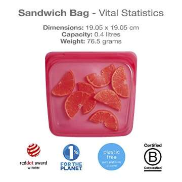 Stasher Re-Usable Food-Grade Platinum Silicone Sandwich Bag for Eating From/Cooking, Freezing and Storing In/Organising/Travelling, 19.05 cm x 19.05 cm, Raspberry