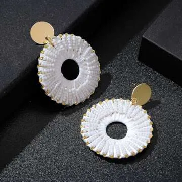 Statement Beaded Earrings Boho Raffia Dangle Earrings Circle Beads Bohemian Dangle Earrings Handmade Bead Fashion Jewelry Drop Earrings for Women, Rattan, No Gemstone