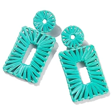 Show more Introducing the stunning Boho Beach Earrings, where tropical charm meets bohemian flair! Crafted with teal raffia straw wrapping, these earrings elevate your style with a rustic yet refined touch. Each pair features a square raffia drop design that allows you to express your individuality and love for statement pieces. With dimensions measuring 2.87 inches in length and 1.45 inches in width, these earrings make a bold statement without being overly heavy, with a total weight of only 1.78 oz per pair.