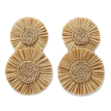 Statement Round Earrings Raffia Palm Bohemian Drop Dangle Earrings for women(ER1205-Sand)