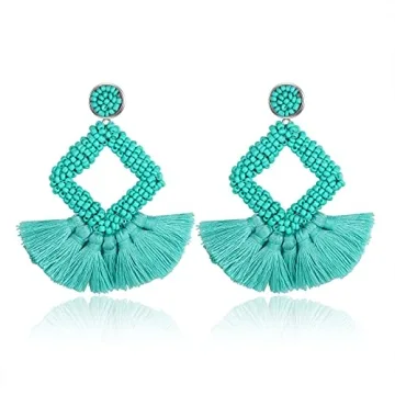 Statement Tassel Drop Earrings - Bohemian Beaded Square Fringe Green Dangle Earrings Gift for Women St Patricks Day Earrings