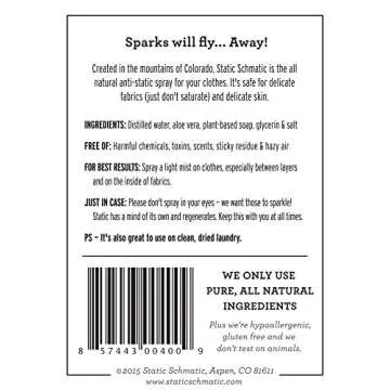 Show more Introducing Static Schmatic, a revolutionary all-natural static removal spray that brings comfort and peace to your clothing and hair. Made with just five safe ingredients, this product is designed to tackle the annoyance of static cling in clothes, linens, upholstery, and even hair. Say goodbye to those awkward clingy moments with a quick spritz!