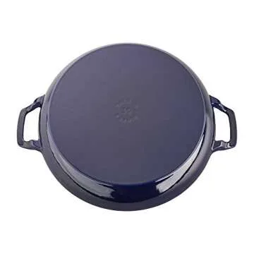 Show moreDiscover the perfect blend of functionality and elegance with the Staub Cast Iron 3.5-qt Braiser in Dark Blue. Crafted in France, this stunning piece is designed not just for cooking, but for making a style statement in your kitchen. The unique design features a wide base coupled with shallow sides that are ideal for browning and braising meats, ensuring that your culinary creations have depth of flavor and appealing textures. The vintage look handles not only enhance the aesthetic but also allow for easy maneuvering, even while wearing oven mitts, making this braiser as practical as it is beautiful.