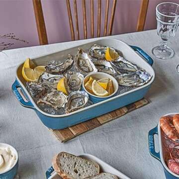 Show moreIntroducing the STAUB Ceramics Rectangular Baking Dish, an exquisite piece of kitchenware designed for both functionality and elegance. Measuring 10.5x7.5 inches, this rustic turquoise baking dish features a stunning vitreous glass porcelain-enamel finish that not only adds a touch of color to your dining table but also ensures high scratch resistance. Made from durable stoneware, this dish is uniquely designed to gently diffuse heat while retaining it exceptionally well, offering optimal cooking results. Its beautiful transitions from oven to table make it a perfect choice for both cooking and serving, blending seamlessly into any culinary setting.