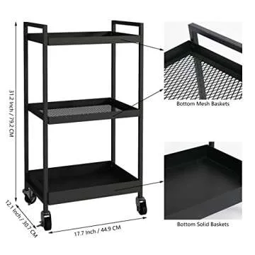 Steehoom 3-Tier Metal Utility Rolling Cart, Heavy Duty Multifunction Rectangular Cart Storage Shelves with Lockable Casters, Black