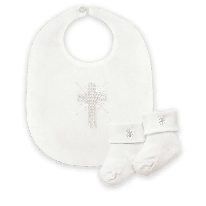 The Christening/Blessing Bib and Bootie Socks Set stands out for its combination of elegance and practicality. The 100% cotton bib is soft and gentle, featuring a beautiful embroidered cross. The bootie socks, made from a cotton, polyester, and elastane blend, are cozy and secure with a fold-over cuff and delicate embroidery. Both items are easy to care for, making them as convenient as they are charming.