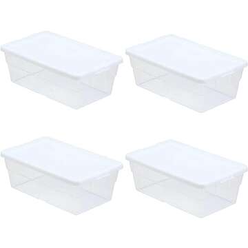Show moreIntroducing the perfect solution for your storage needs - the Pack of 4 Clear Storage Boxes with white lids! These versatile boxes are designed to keep your items organized and easily accessible, making them a must-have for any home. Measuring at 13.2 x 8.5 x 4.8 inches and holding up to 6qt, these boxes are ideal for storing average-sized shoes, accessories, and even seasonal items.