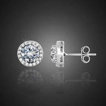 Sterling Silver Halo Stud Earrings with CZ Center Stone- 925 Sterling Silver Stud earrings for women (White)