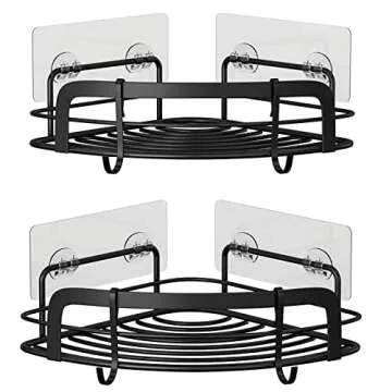 STEUGO Black Bathroom Corner Shower Shelfs, Adhesive Wall Mounted Shower Caddy with 4 Movable Hooks, Rustproof Stainless Steel Bathroom Shower Organizer, No Drilling Wall Mount 2-Pack