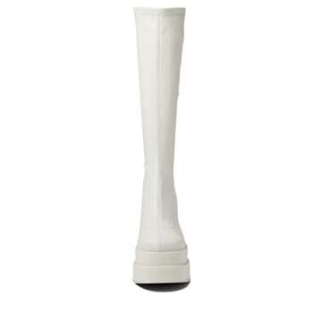 down... Show more Platform heel knee boot|Pull-on style with stretch upper (fits most leg sizes)|Block heel with tiered front platform|5 inch heel height|2.25 inch platform|Size 6 measurements: 11 inch shaft top circumference 14.75 inch shaft height|Size 8 measurements: 14.25 inch shaft top circumference 15 inch shaft height|Size 10 measurements: 16.25 inch shaft top circumference 15.25 inch shaft height|Vegan leather upper material|Textile and vegan leather lining|Synthetic sole|Fit tip: if you are in between sizes size down a half size|Imported