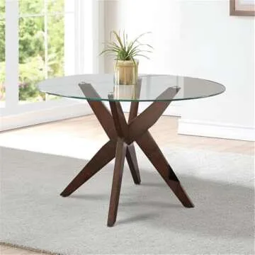 Steve Silver Amalie 48" Round Modern Dining Table with Tempered Glass Top & Solid Rubberwood Base, Architectural Pedesta, Conversational Feel, in Walnut/Clear Finish
