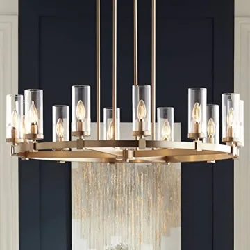 Show more Illuminate your home with the exquisite Stiffel Aron Brass Gold Wagon Wheel Chandelier, a stunning blend of modern style and rustic charm. Measuring 36 inches wide and 9 1/2 inches high, this impressive chandelier is designed to be the centerpiece of any room, drawing attention with its elegantly crafted brass-finished metal base. When combined with its 12 clear glass cylindrical shades, it creates a beautiful play of light that enhances the ambiance of any space. This chandelier is perfect for high ceilings, with a maximum height of 46 inches and a minimum height of 16 inches, making it adaptable for various ceiling types while exuding a sophisticated touch to your decor.
