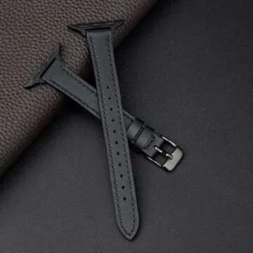 STIROLL Slim Leather Bands Compatible with Apple Watch Band 38mm 40mm 41mm 42mm(Series 10), Top Grain Leather Watch Thin Wristband for iWatch Ultra SE Series 10/9/8/7/6/5/4/3/2/1(Black with Black)