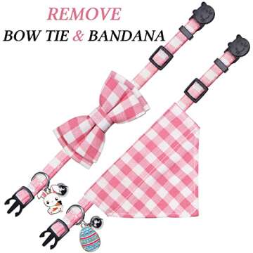 Show more Introducing the STMK 2 Pack Easter Cat Collar Bandana with Bell, a delightful way to celebrate the Easter holiday with your furry companions. This charming package features two distinct cat collars: an adorable Easter bow tie collar and a stylish bandana collar, both adorned with festive Easter elements. Made from soft, skin-friendly cotton, these collars ensure your pet not only looks fabulous but also feels comfortable and secure during every feline adventure.