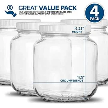 - Generous Size: Each wide-mouth jar holds a capacity of 64 oz (half gallon), with dimensions of 17.5" circumference x 6.28" height. Perfect for large batches!