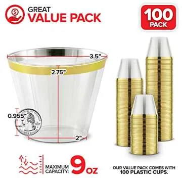 In addition to being convenient, our cups are a smart storage solution; they’re easily stackable, ensuring that they won't take up much room in your kitchen or catering supplies. With a generous pack of 100 cups, your parties will always be ready to impress, all while providing excellent value for your money. Say goodbye to cracked glasses and hello to the elegance and practicality of our Gold-Rim Disposable Party Cups!