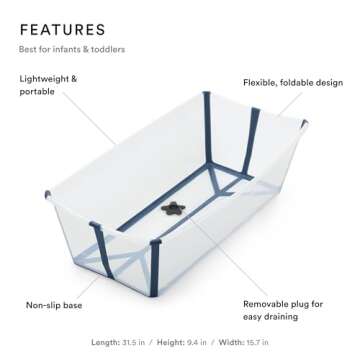 Show moreExperience hassle-free bath time with the Stokke Flexi Bath X-Large in a beautifully transparent blue design! This foldable baby bathtub has been expertly crafted to accommodate children from infancy to age six, making it a perfect solution for families on the go. Its lightweight structure and innovative design allow for convenient use whether you’re at home or traveling, ensuring that bath time is delightful and stress-free. The spacious interior is designed for splashing fun with siblings, allowing your little ones to enjoy their bath together while the high-quality, durable materials ensure long-lasting use. With dimensions of 31.5 x 15.7 x 9.4 in, it redefines versatility while fitting snugly into most bathtubs and showers.