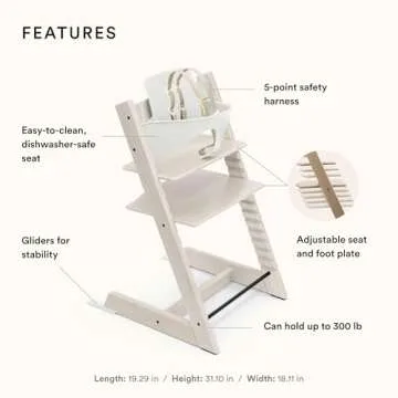 Show moreThe Stokke Tripp Trapp High Chair is more than just a piece of furniture; it is a transformative dining experience designed with your child’s growth and comfort in mind. Crafted by the renowned Stokke brand, this chair features an array of remarkable characteristics, including its sleek and modern aesthetic, ensuring it will complement any dining space beautifully. Its ergonomic design allows your little one to sit comfortably at the table with ease, fostering family bonding right from the start. Equipped with an innovative washable 5-point harness, it guarantees maximum safety and comfort for babies aged 6 to 36 months. Made to last, the chair is solidly constructed to support up to 242 lbs, making it suitable not only for children but also for adults, allowing this high chair to grow alongside your family while serving as a cherished item for years to come.