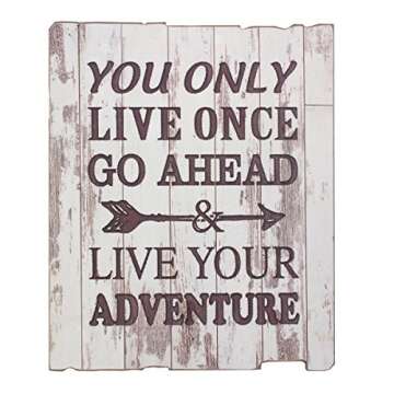 Show moreElevate your home decor with the Stonebriar High Plains Live Your Adventure Weathered White Wood Wall Art. Sized at 18.9" x 15.8", this stunning piece is versatile enough to enhance the ambiance of various spaces such as your living room, entryway, office, bedroom, or hallway. The wall art features a captivating quote, "You Only Live Once, Go Ahead & Live Your Adventure", which serves as a daily reminder to embrace life's adventures. The artwork is beautifully crafted with a painted white finish and lightly distressed details, offering a rustic charm that complements both traditional and modern interiors.